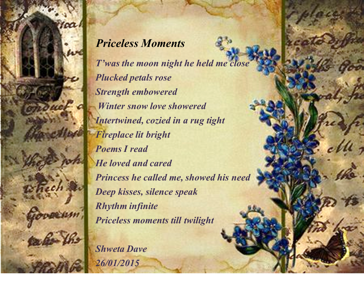 Priceless MomentsTried my hand at a new poetry form called Minute Poetry. The Minute Poem is rhyming verse form consisting of 12 lines of 60 syllables written in strict iambic meter. The poem is formatted into 3 stanzas of 8,4,4,4; 8,4,4,4; 8,4,4,4 syllables. The rhyme scheme is as follows:aabb, ccdd, eeff. Have tried to fit in the syllables taking some liberties in order to maintain the mood of the poem theme.